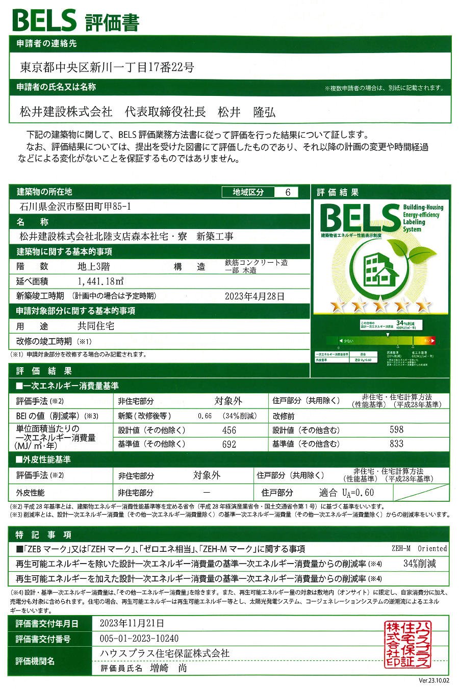 | 5 | 松井建設森本社宅 | 金沢 | RC・W 3F 1423㎡ | 2023 | ZEH-M Oriented | 34% |
